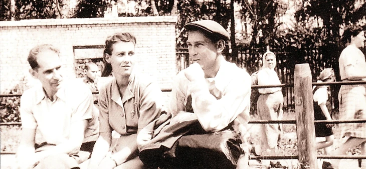 1947. Москва. Сокольники. Стадион на Ширяевом поле. Слева направо: Павел Цетлин, Тамара Моисеева, Владимир Виноградов
