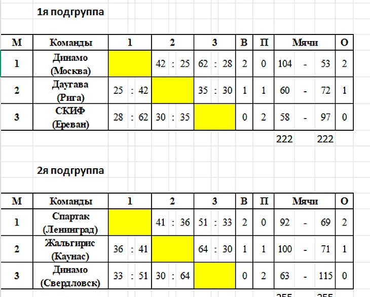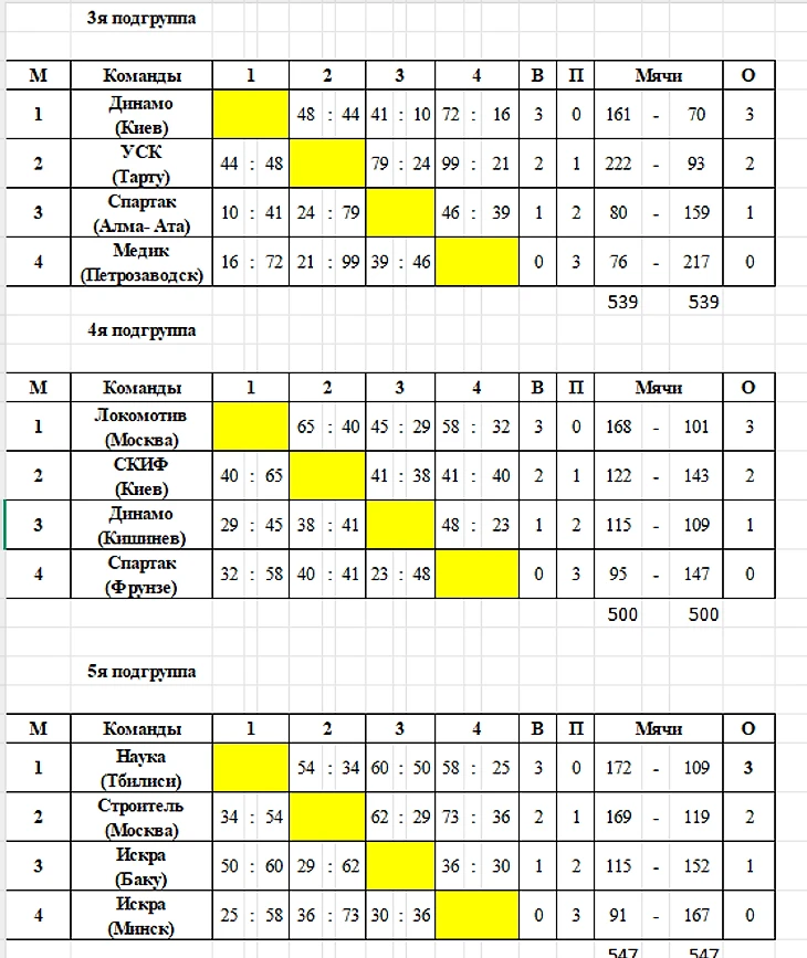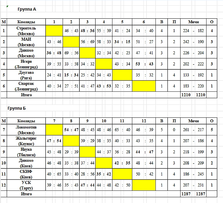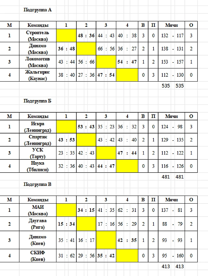Обычно первый этап чемпионата совсем дежурный, но в этот раз случилось несколько любопытных событий. Тбилисская «Наука» в стартовом туре разгромила московский «Строитель» — 54:34. Киевлянки из СКИФа едва-едва выиграли у Фрунзе (41:40) и Кишинева (41:38). Зарубились киевское «Динамо» и тартуский УСК — 48:44. Ленинградский «Спартак» побеждает пятую команду прошлого розыгрыша «Жальгирис» (41:36) и занимает первое место в своей группе.