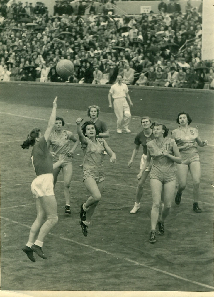 25 мая 1952. Москва. Стадион «Динамо». Матч III чемпионата Европы СССР — Чехословакия — 52:29. С мячом Мирослава Томашкова (№ 11). Перед ней — Лидия Алексеева, На втором плане — Раиса Маментьева и Валентина Копылова (№ 6), прикрывающие лидера соперника Дагмару Губалкову