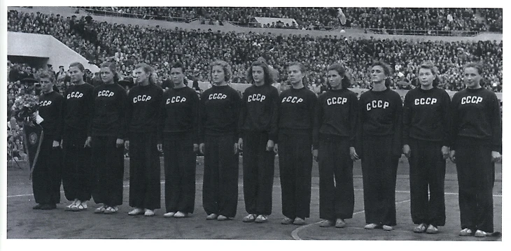25 мая 1952. Москва. Стадион «Динамо». Сборная СССР — чемпион Европы. Слева направо: Лидия Алексеева, Валентина Назаренко, Марет-Май Отса, Нина Максимова, Тамара Моисеева, Раиса Маментьева, Дзидра Узтупе, Нина Урданг, Зоя Стасюк, Валентина Копылова, Евгения Зарковская, Галина Степина
