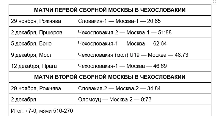 Главный матч турне состоялся 5 декабря в Брно, где сборной Москвы противостояла национальная команда Чехословакии. Довольно шаткое преимущество гостей — 64:62. В повторной встрече команд в венчающем турне матче в Праге преимущество сборной Москвы было более ощутимым — 69:46. Остальные пять матчей завершались победами сборных Москвы за явным преимуществом.