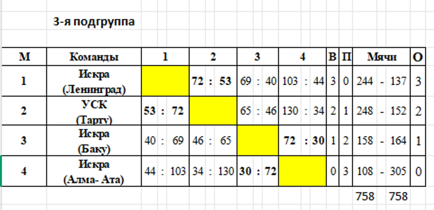 Ленинградский «Спартак» приехал без своего молодого тренера Александра Гомельского. Будущий мировой триумфатор окончил Военный институт физической культуры и получил распределение в армейский спортивный клуб Риги, больше с женскими командами он работать не будет. «Спартак» с треском вылетает из розыгрыша Кубка, вчистую проиграв землячкам из «Искры» — 48:71.