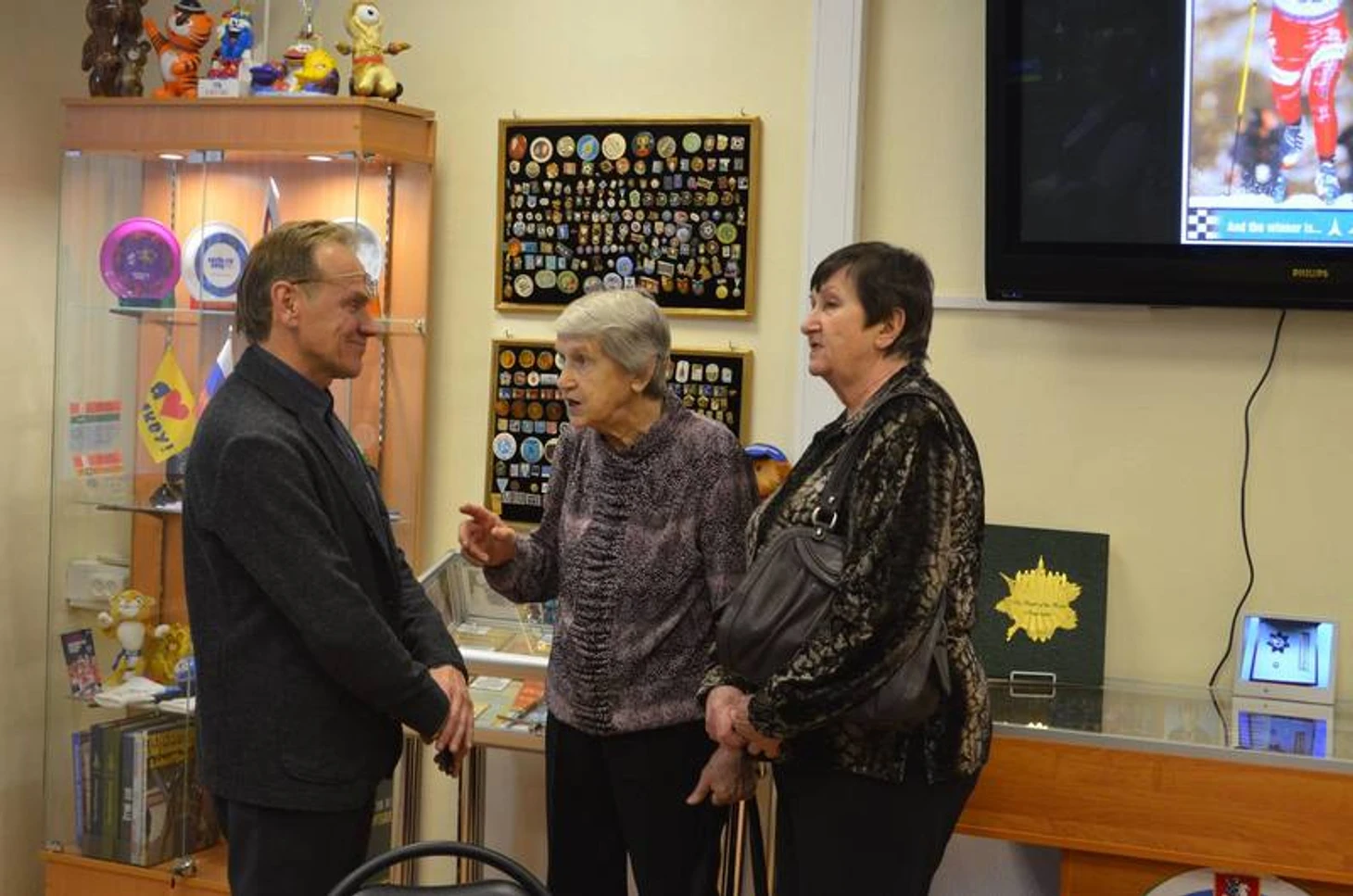 2016 год. Зеленоград. Окружной Центр физкультуры и спорта. Открытие музея «Спортивная слава». Двукратная олимпийская чемпионка по волейболу Роза Салихова (крайняя справа) и Нина Арцишевская с первым зампрефекта Зеленограда Алексеем Михальченковым