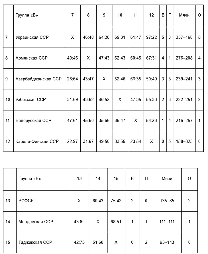 Баскетбол, действительно, в некоторых республиках прогрессирует. Сборная огромной РСФСР в первый же день уступает Узбекистану 43:44 (сборная России в итоге займет последнее место в группе, скажется несыгранность команды). Молдавия на равных играет с Литвой, но хватает ее только на первый тайм — 31:53. В центральном матче первого дня сборная Москвы побеждает Украину — 48:36.