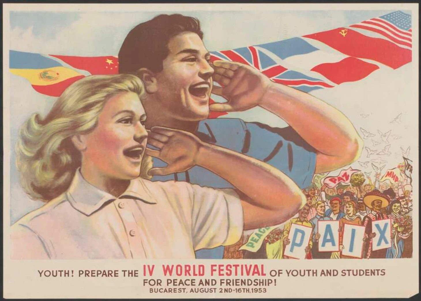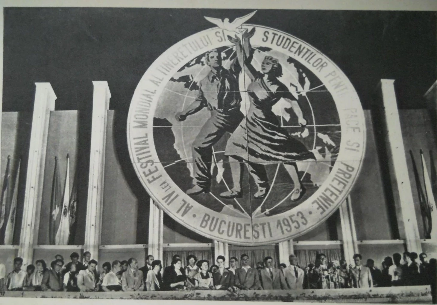 Август 1953. Бухарест, Румыния. Постер IV Всемирного фестиваля молодежи и студентов. Гигантский логотип на главной трибуне фестиваля