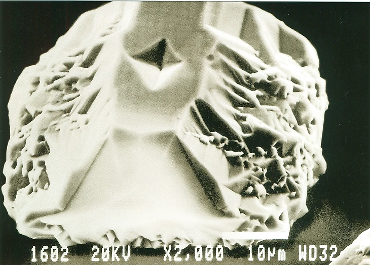 Плоды научной работы Нины Арцишевской. Микрофотография на электронном микроскопе кристалла NaCl. В центре — отпечаток алмазного индентера микротвердомера ПМТ-3, увеличение — 2000 раз