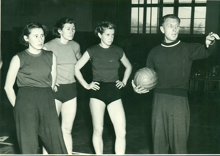 1958. Тренировка сборной команды СССР. Тренер Иван Лысов и (слева направо): Раиса Михайлова, Нина Максимова и Нина Арцишевская