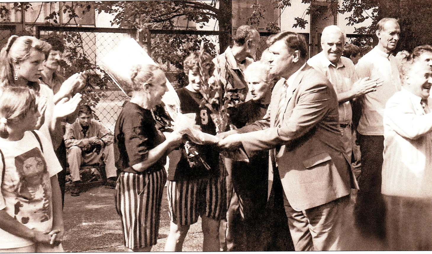 3 сентября 1995. Москва, стадион «Локомотив». Галину Ярошевскую с 65-летием от имени Госдумы поздравляет А. С. Матросов. Слева направо: Людмила Базаревич (Куканова), Геннадий Вольнов, Раиса Михайлова, Юрий Корнеев, Виктор Зубков, Владимир Збандут