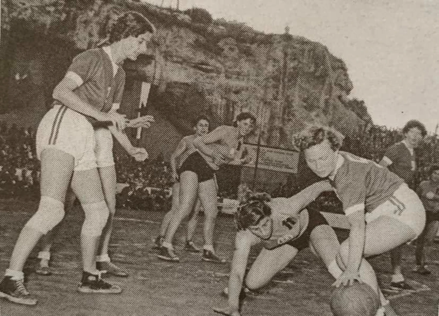 1954. Белград, Югославия. Стадион «Ташмайдан». IV чемпионат Европы. Игра сборной Югославии предположительно со сборной СССР. С мячом Гордана Барага (№ 11), рядом Эмилия Радулович (№ 7) и Александра Гец (№ 9)