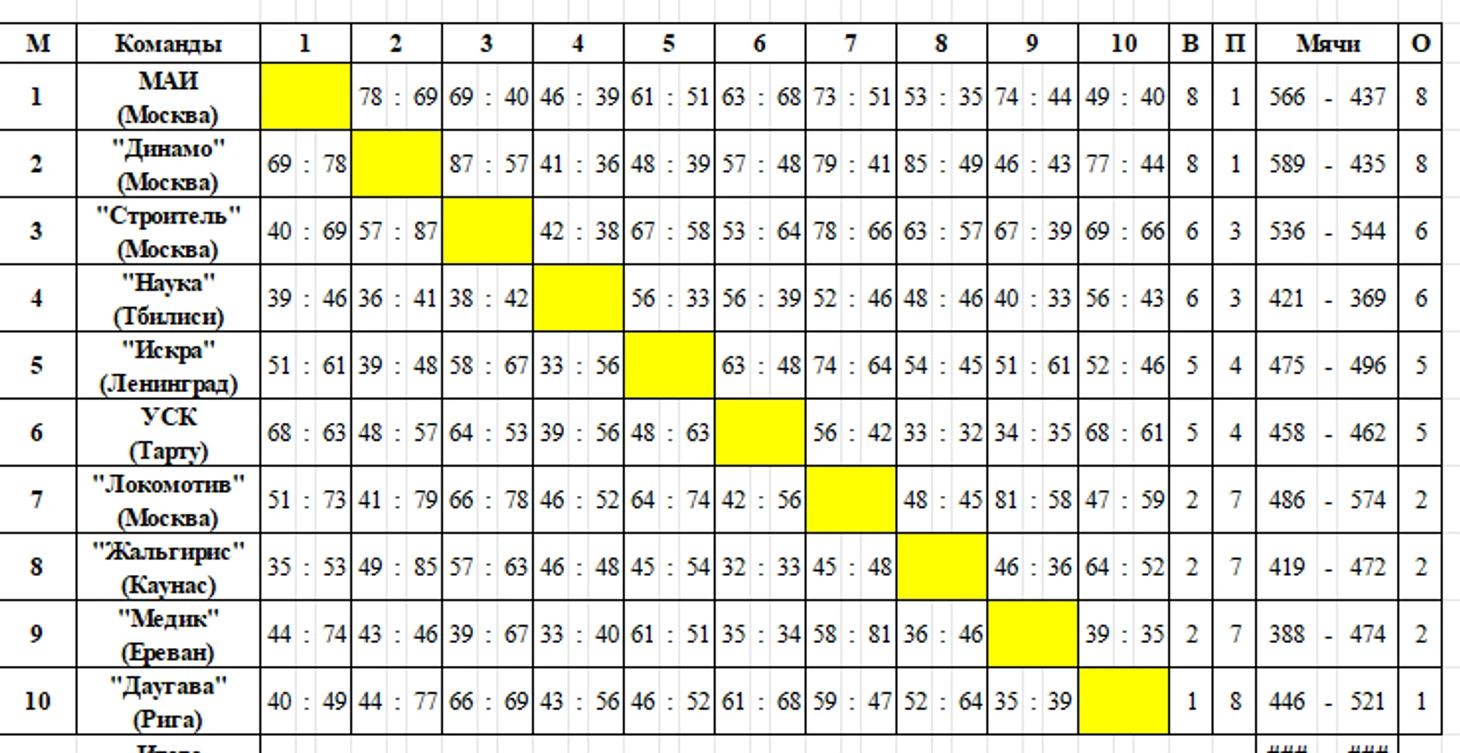 Итоговая классификация XXI чемпионата СССР. 1. МАИ (Москва). 2. «Динамо» (Москва). 3. «Строитель» (Москва). 4. «Наука» (Тбилиси). 5. «Искра» (Ленинград). 6. УСК (Тарту). 7. «Локомотив» (Москва). 8. «Жальгирис» (Каунас). 9. «Медик» (Ереван). 10. «Даугава» (Рига). 11. «Динамо» (Кишинев). 12. «Спартак» (Рига). 13. «Искра» (Баку). 14. «Медик» (Ростов-на-Дону). 15. «Наука» (Сталинабад). 16. сб. Алма-Аты. 17. «Наука» (Киев). 18. «Наука» (Ленинград). 19. сб. Ташкента. 20. «Искра» (Минск). 21. «Калев» (Тарту). 22. сб. Ашхабада.