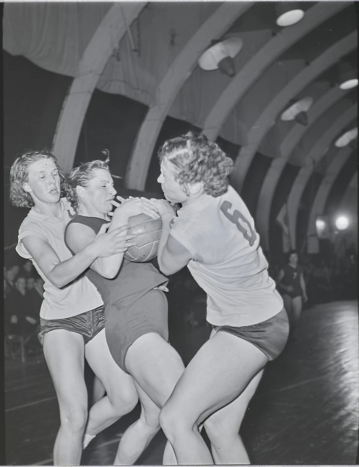 14 марта 1959. Москва. Матч II Всесоюзных зимних соревнований команд класса «А» «Динамо» (Москва) — ТТТ (Рига) — 53:64. Скайдрите Смилдзиня (крайняя слева) борется за мяч сразу с тремя баскетболистками «Динамо» — Эммой Ваниной, Ниной Максимильяновой (№ 3) и Ниной Максимовой (№ 4)