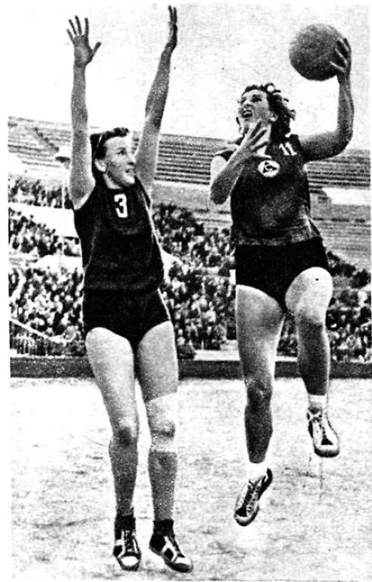 15 февраля 1959. Москва. Матч ¼ финала I розыгрыша Кубка европейских чемпионов «Динамо» (Москва) — АЗС (Варшава, Польша) — 73:65. Полька Ромуальда Олесевич (№ 6) готовится к броску, ей пытается помешать Эмма Ванина (№ 13)