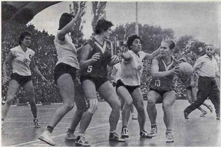 11 июня 1960. София, Болгария. VII чемпионат Европы. СССР — Болгария — 52:50. Галину Ярошевскую (№ 13) опекает болгарка Кристина Гешева. Под кольцом ожидает передачи Валентина Костикова (№ 5)
