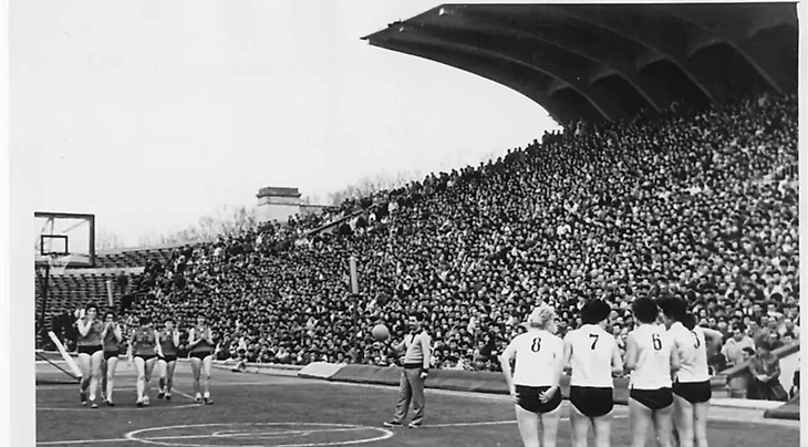 Октябрь 1959. Москва. Малая спортивная арена Центрального стадиона им. Ленина. III чемпионат мира. Скайдрите Смилдзиня исполняет штрафной бросок