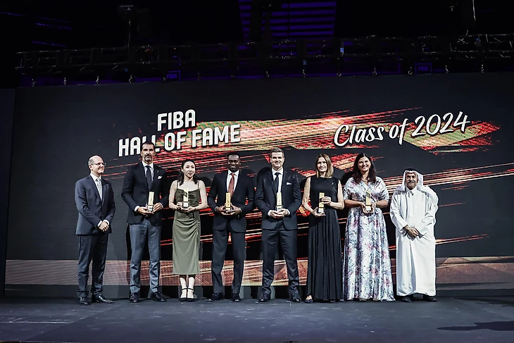 14 сентября 2024 года. Сингапур. Церемония введения в Зал славы баскетбола ФИБА. Слева направо: генеральный секретарь ФИБА Андреас Загклис, Предраг Стоякович, Мяо Лицзе, Ромен Сато, Кирк Пенни, Данира Накич-Билич, старшая дочь Скайдрите Смилдзини-Будовска Агния Шмите