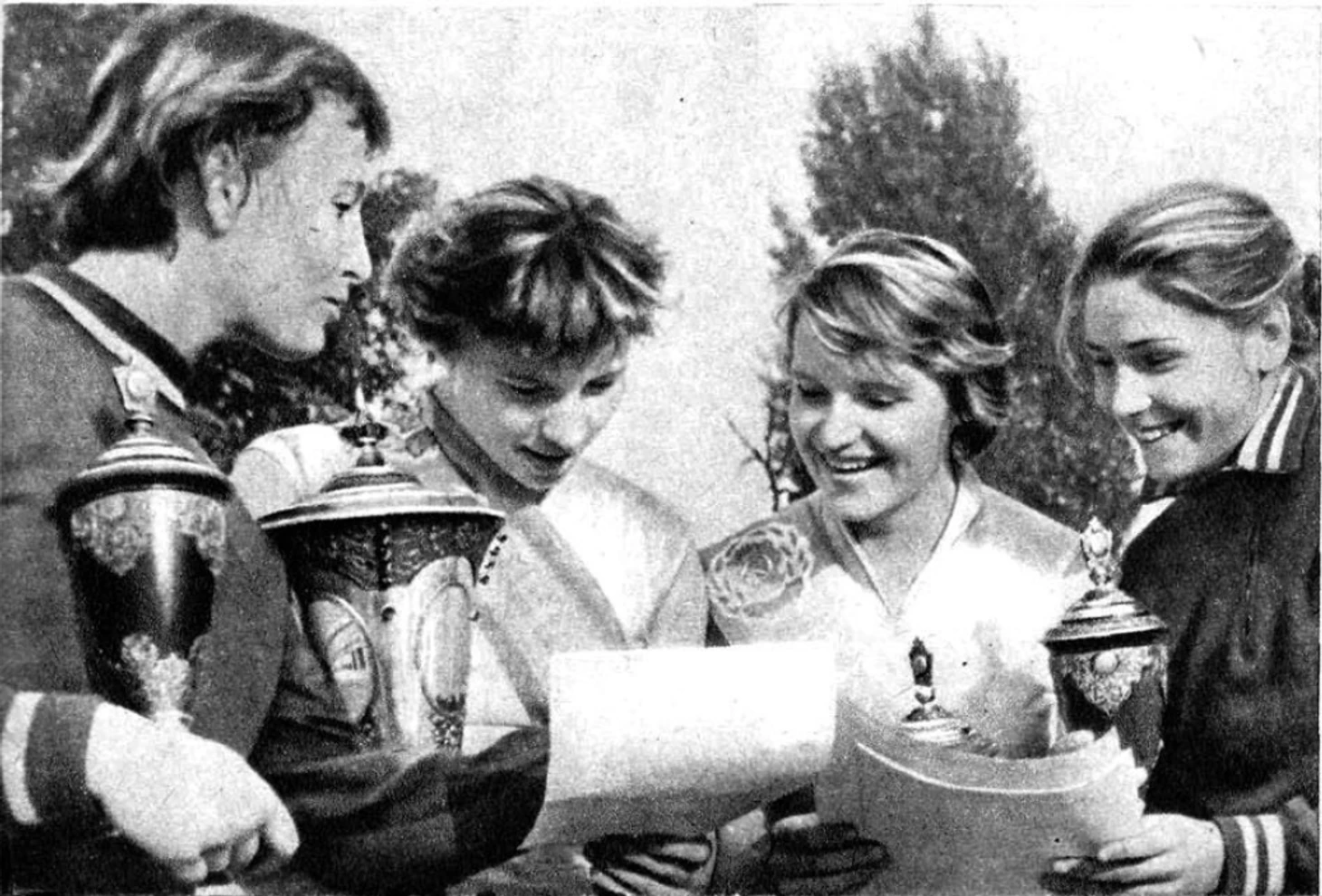 1 июля 1961. Рига. ТТТ-«Даугава» — обладатель Кубка Европы для клубных команд. Слева направо: Дзидра Карамышева, Скайдрите Смилдзиня, Сильвия Равдоне, Ивета Краукле, Хелена Битнере, Лигита Алтберга, Гуна Карлсоне. Обладателями Кубка Европы для клубных команд также стали (нет на снимке): Инара Апсе, Хелена Хехта, Ария Рамбениеце, Иоланта Калныня, Ингрида Струповича, Сармите Мартынова, тренер — Ольгерт Алтбергс