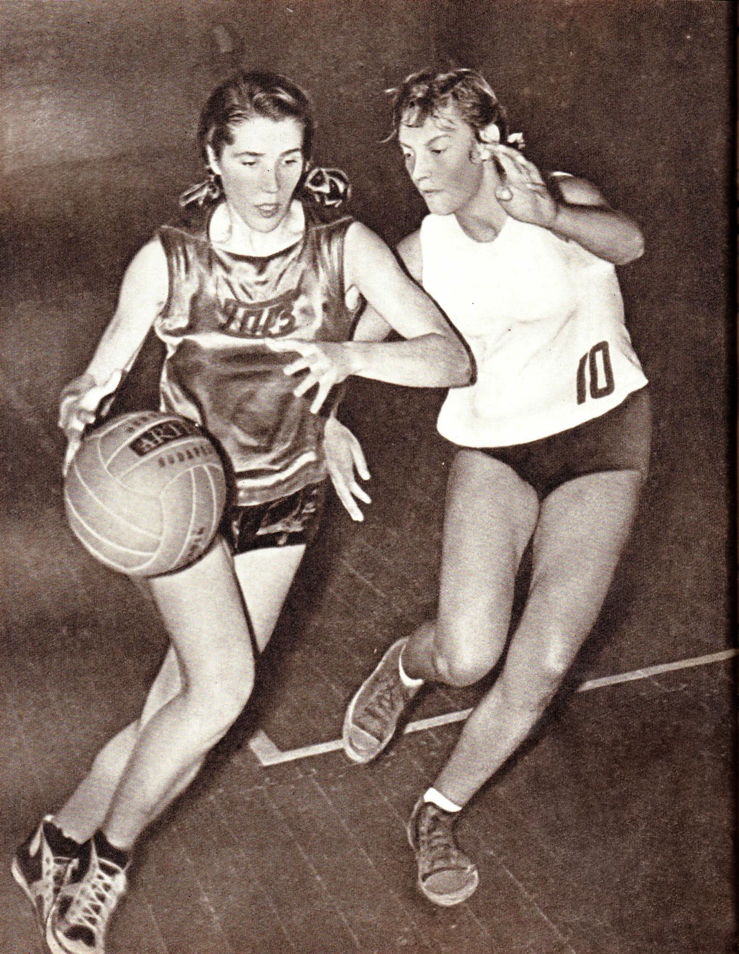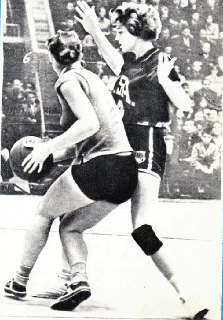 16 августа 1961. Москва. Малая спортивная арена Центрального стадиона им. Ленина. Матч Спартакиады профсоюзов СССР Литва — Эстония — 58:57. Юрате Дактарайте (в желтом) опережает в борьбе за мяч Валентину Куллам. На заднем плане — Гражина Тулявичюте