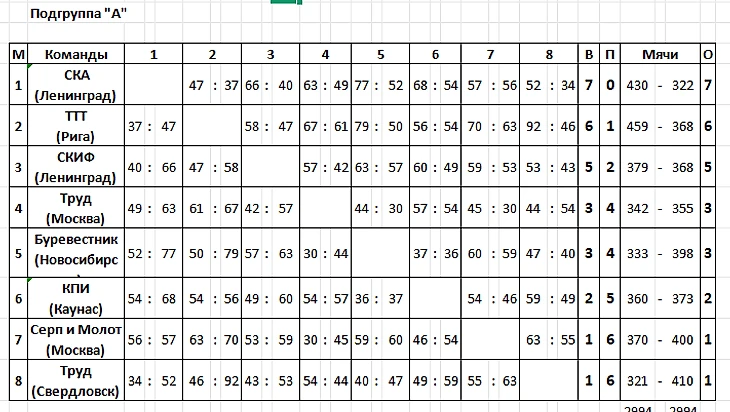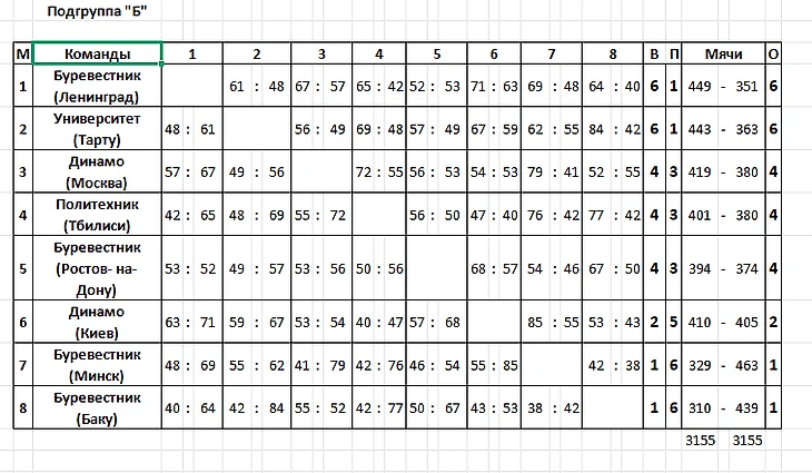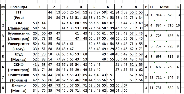Но в Тарту, где собрались все восемь команд (сыграть предстояло по 4 игры), ленинградский «Буревестник» в первом же матче уступает «Труду» — 49:60.
