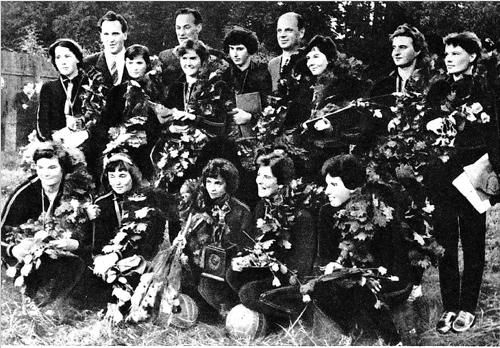 1993. Ветераны ТТТ на мероприятии, посвященном 35-летию создания команды. Слева направо: Скайдрите Будовска (Смилдзиня), Сильвия Кродере (Равдоне), Ивета Чикуте (Краукле), Сармите Волбете (Мартынова), Мирдза Ионане, Хелена Хехта (Битнере), Ария Римбиниеце, Гуна Карлсоне, Розалия Земвалде (Лапинска), Дзидра Карамышева (Узтупе), тренер Ольгерт Алтбергс