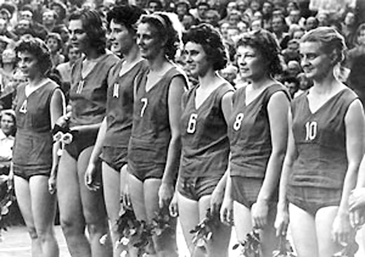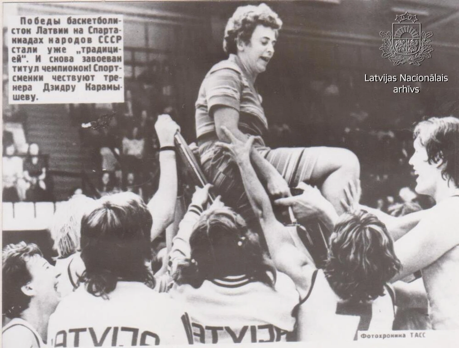 Июль 1975. VI Спартакиада народов СССР. Игроки сборной Латвийской ССР — победители турнира — качают тренера Дзидру Карамышеву. Первая слева — Дзинтра Грундмане, первая справа — Ульяна Семенова