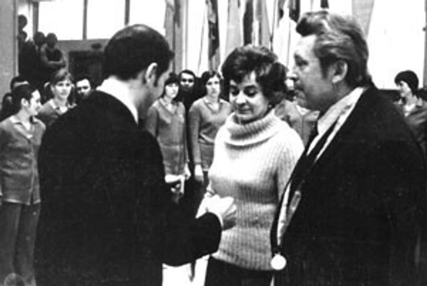 1973. Тандем тренеров ТТТ Дзидра Карамышева и Раймондс Карнитис получают золотые медали чемпионата СССР