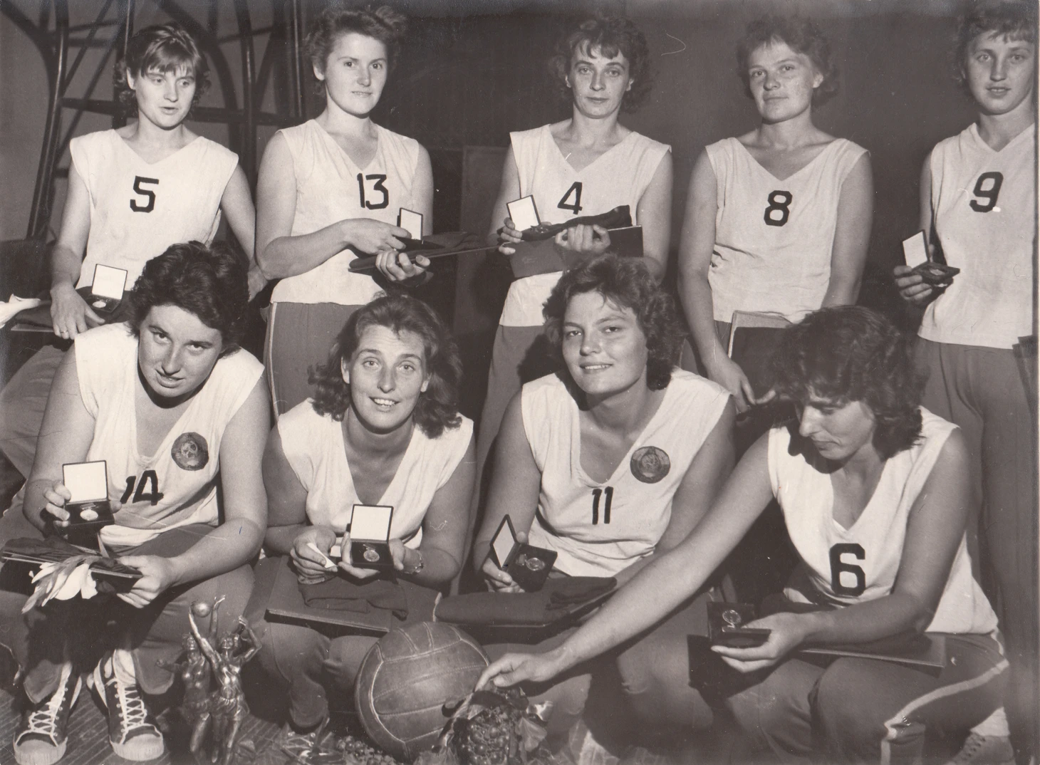 18 сентября 1961. Кишинев. XXVIII чемпионат СССР. ТТТ Рига — чемпион. Сидят (слева направо): Сильвия Равдоне, Ивета Краукле, Скайдрите Смилдзиня, Хелена Битнере (Хехта). Стоят: Инара Пиртниека (Апсе), Ингрида Струповича, Дзидра Карамышева, Лигита Алтберга, Ария Рембиниеце. На фото нет Иоланты Калныни, Сармите Мартыновой