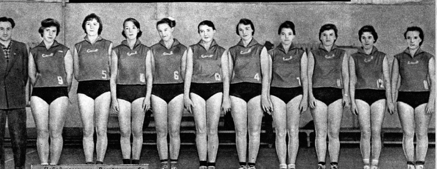 1961. Ставрополь. XXVIII чемпионат РСФСР. Постановочный снимок лучших игроков РСФСР (слева направо): центровая Светлана Лабичева («Заря» Пенза), лучший игрок команды-чемпиона Галина Варламова («Уралмаш» Свердловск), разыгрывающая Нелли Чиянова («Уралмаш»), лучшая по пробитию штрафных Тамара Пыркова («Буревестник» Ростов-на-Дону)