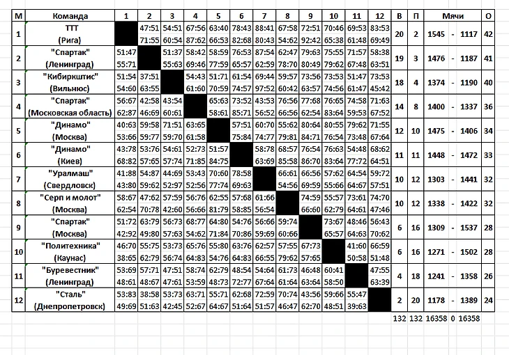 Итоги тура в Каунасе (по 5 матчей): «Спартак» (Ленинград), «Динамо» (Москва), «Спартак» (Московская обл.) — по 4 победы, «Динамо» (Киев) — 2; «Спартак» (Москва) — 1; «Политехника» — 1.