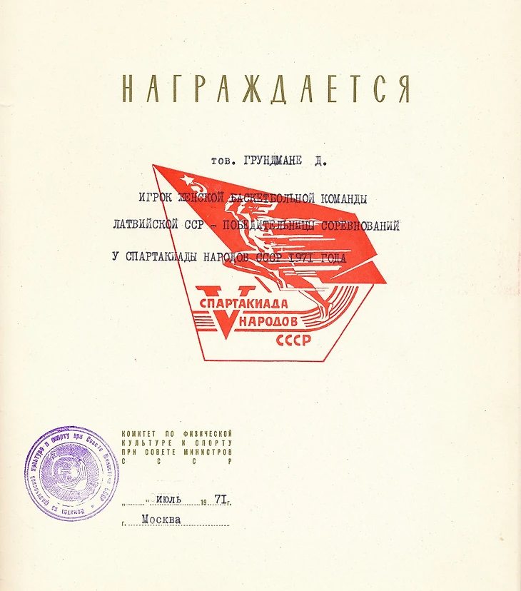 Диплом, врученный Дзинтре Грундмане за победу в составе Латвийской ССР на V Спартакиаде народов СССР