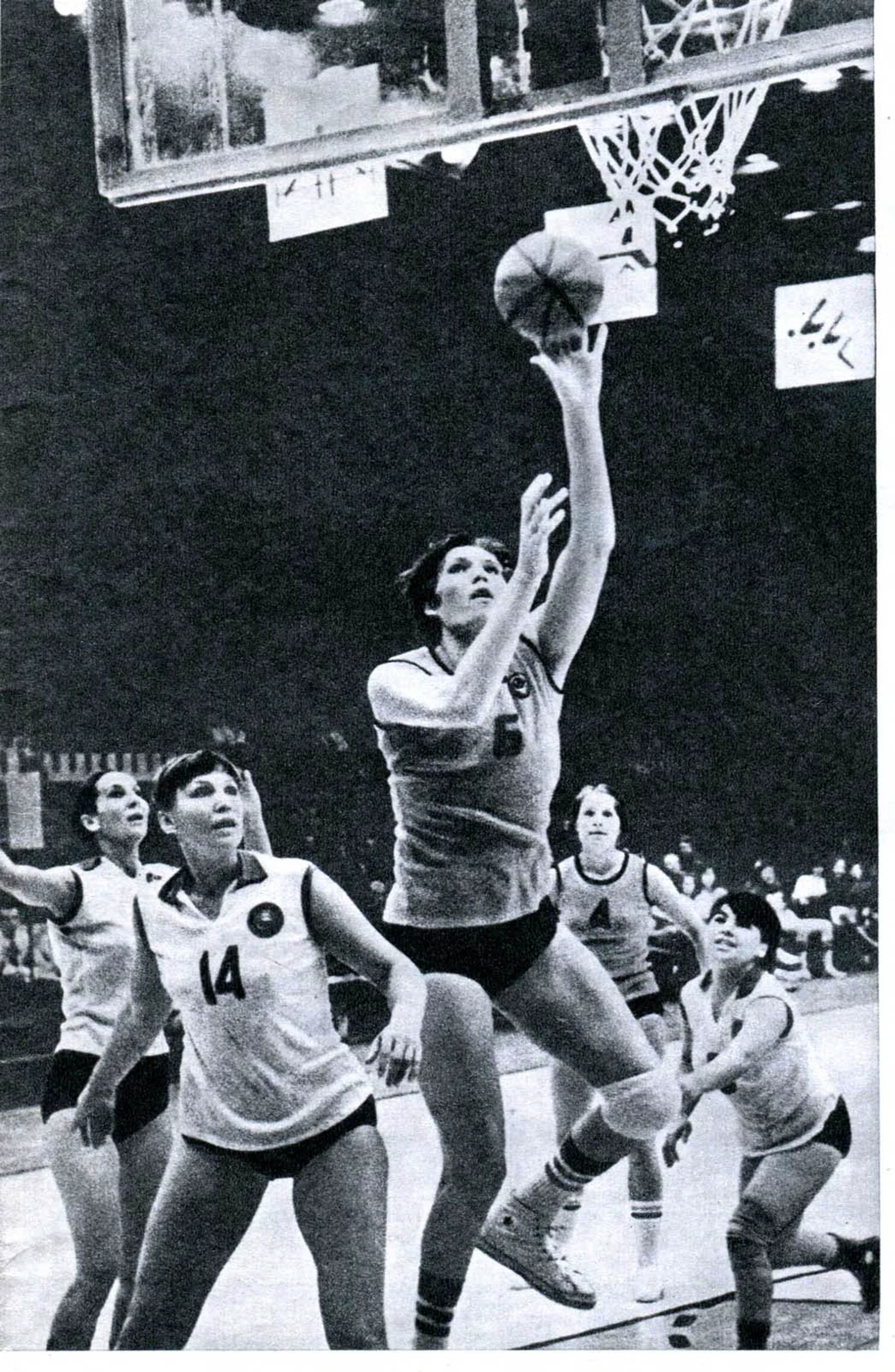 26 июля 1976. Монреаль. Матч женского баскетбольного турнира XXI Олимпийских игр. СССР — Япония — 98:75. В атаке центровой сборной СССР Ульяна Семенова