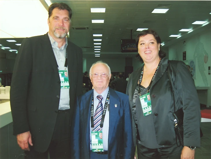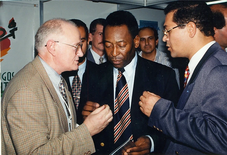 Евгений Гомельский дарит динамовский значок легенде мирового футбола Пеле