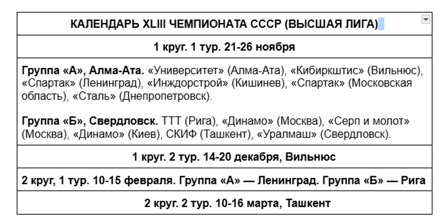 В XLIII ЧЕМПИОНАТЕ СССР (ВЫСШАЯ ЛИГА) участвуют 12 клубов. Весь турнир умещается в 26 календарных дней и в четыре тура — два раздельных (когда команды собираются «шестерками» в двух городах) и двух общих «съездах». Матчи в пределах тура проходят по олимпийскому циклу — три матча подряд, день отдыха и еще два (или три) матча. В обобщенном виде расписание турнира выглядело так.