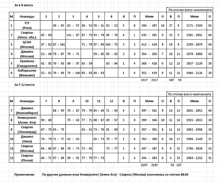 В Свердловске на большом общем туре многого ждали от встречи лидеров турнира ТТТ и подмосковного «Спартака», не терявших до 19 ноября очков. Но расходились зрители разочарованными игрой спартаковок, которые ничего не смогли противопоставить чемпиону страны и его лидеру Ульяне Семеновой. В дебюте центровая рижанок действовала довольно скромно: шесть бросков — одно попадание. Но она всегда оттягивала на себя двух–трех соперниц. И тогда за дело брались вторая центровая ТТТ Феодорова, а также Сауша и Шулце.