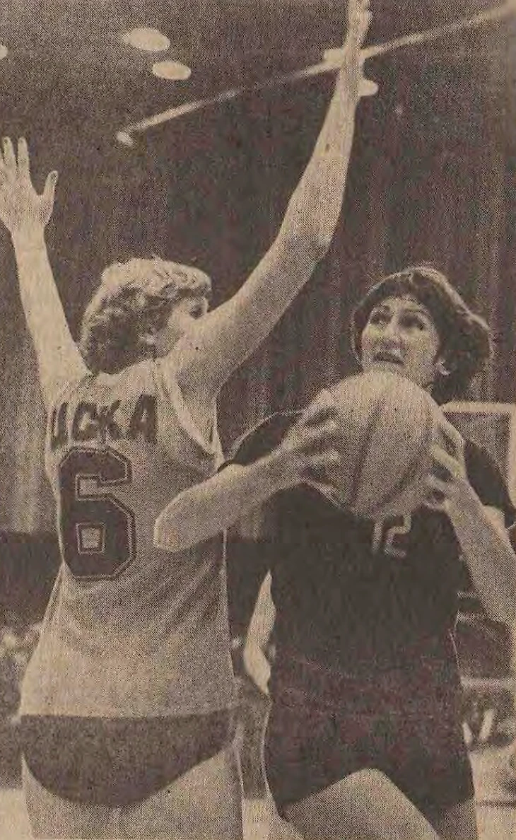 18 октября 1979. Москва. Дворец тяжелой атлетики ЦСКА. Матч XLVII чемпионата СССР ЦСКА — «Спартак» (Московская обл.) — 81:87. Центровая спартаковок Нелли Ферябникова (с мячом) против Олеси Барель