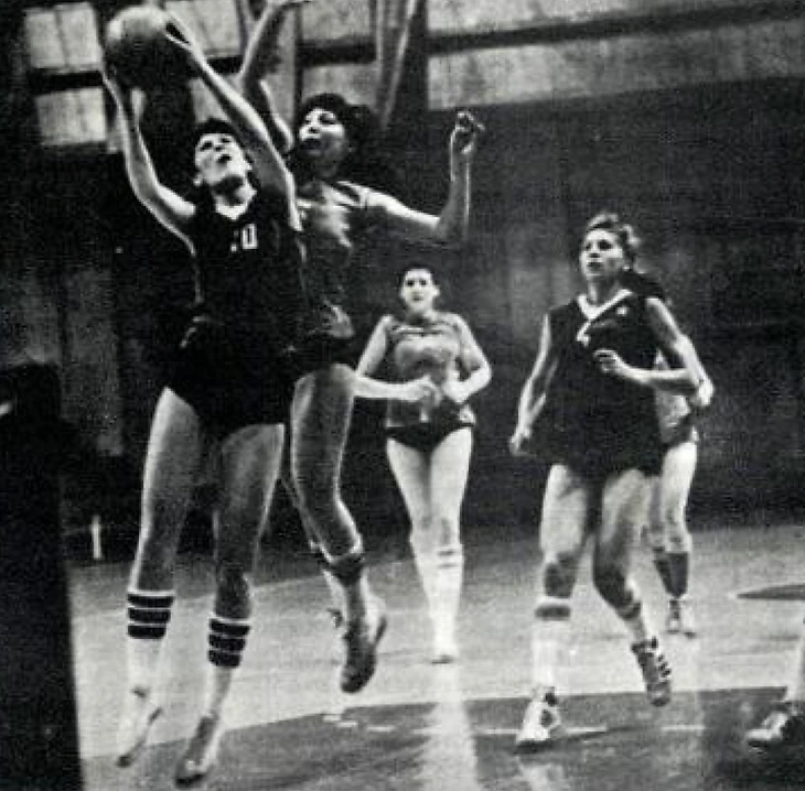 Матч XLVII чемпионата СССР «Спартак» (Московская обл.) — ТТТ (Рига). Спартаковки Нелли Ферябникова (№ 12), Татьяна Надырова (№ 4) пытаются не дать рижанке Ульяне Семеновой (№ 6) выиграть подбор