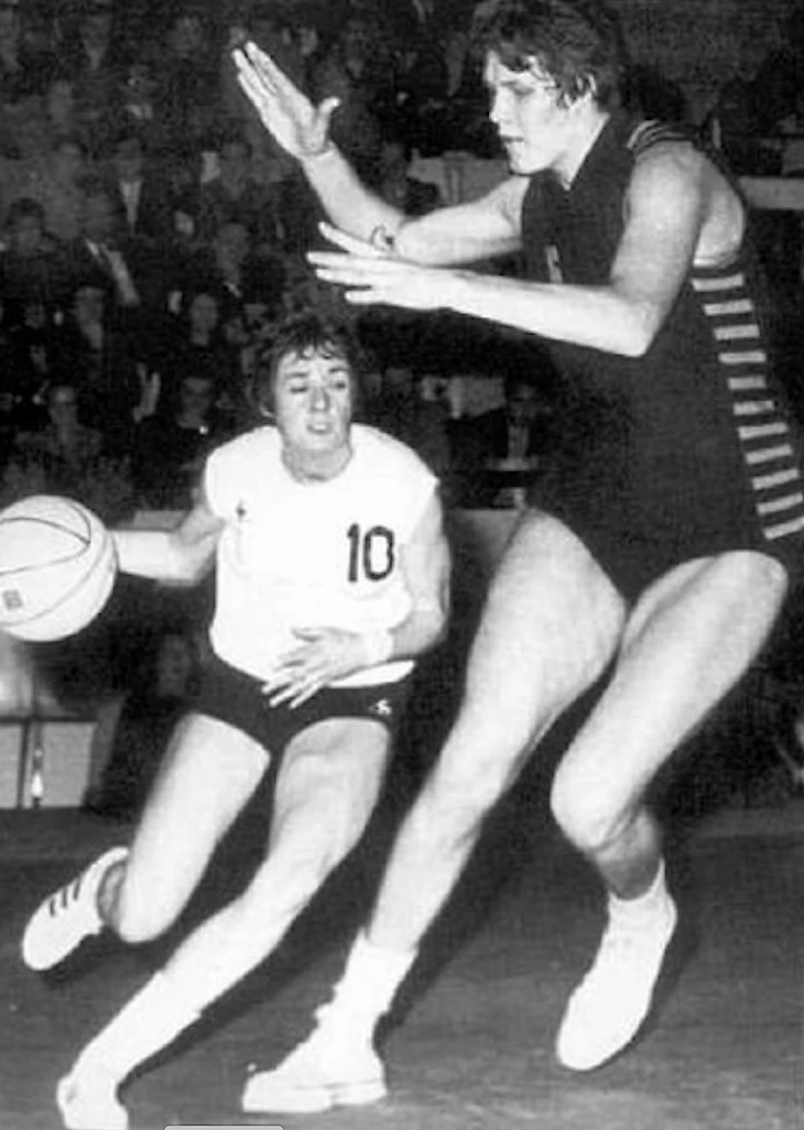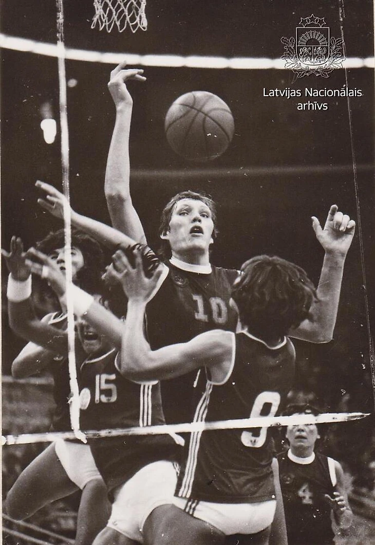 Январь 1980. Вильнюс. Матч XLVII чемпионат СССР «Кибиркштис» — «Динамо» (Москва) — 75:78. Вида Беселене (в центре в темном) против Ларисы Кузнецовой (№ 7). Справа Людмила Пономарева (№ 5), слева Татьяна Овечкина (№ 8)