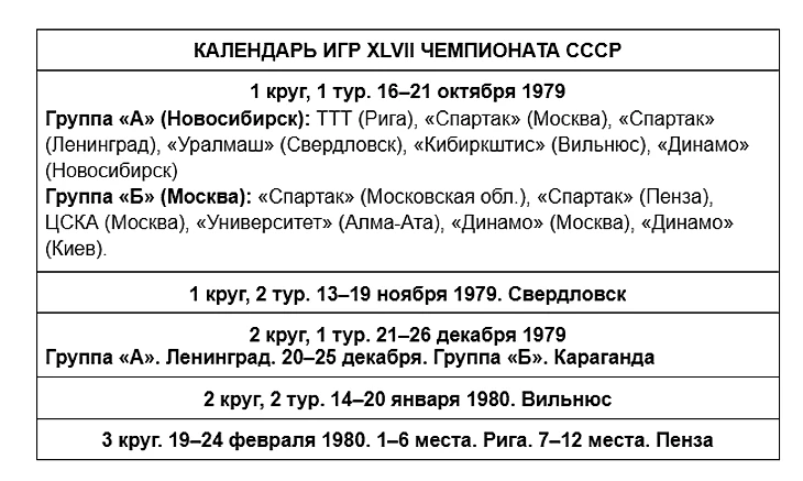 Для лучшей подготовки сборной страны к московской Олимпиаде–1980 Федерация пересмотрела формулу чемпионата. Предыдущие проводились по двухступенчатой системе, а шестерка лучших команд два круга проводила с разъездами. В чемпионате СССР–1980 разъездные туры упразднены, второй этап сократили до одного тура. Итого, ведущие клубы должны были сыграть между собой по три раза.