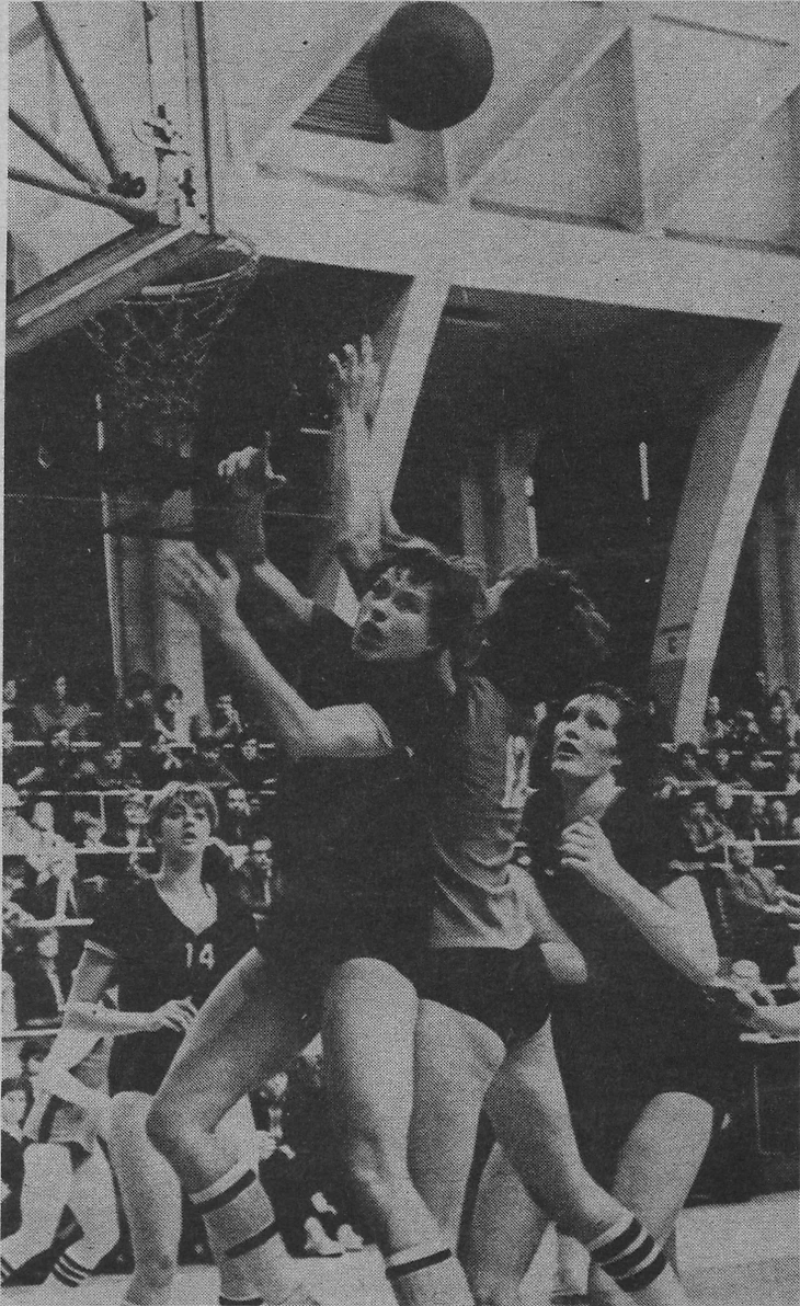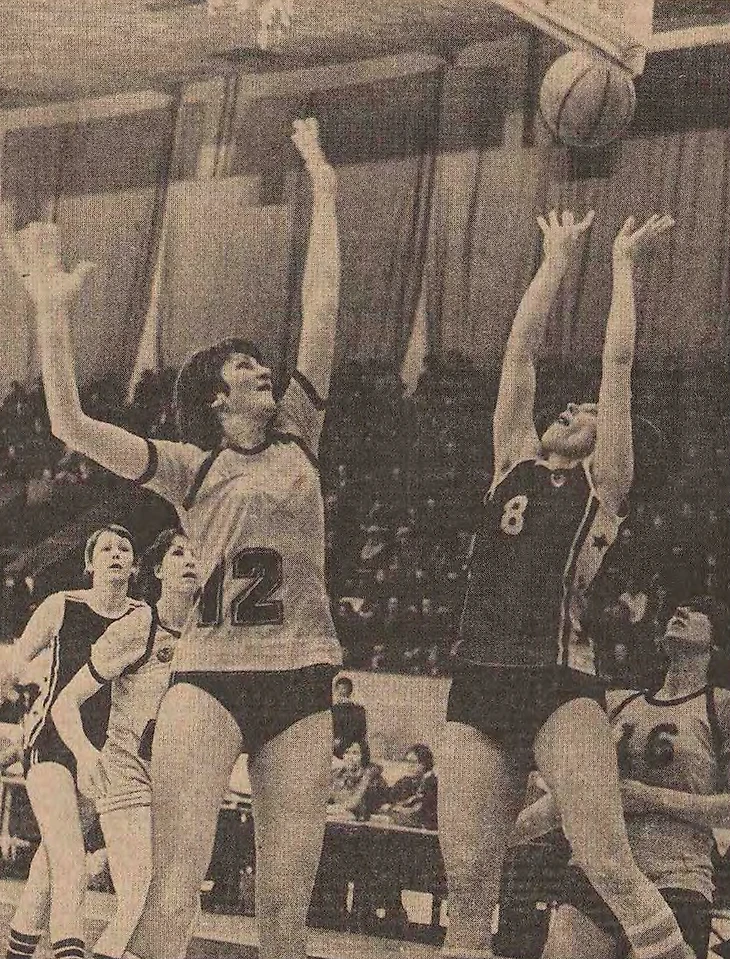 25 марта 1981. Рига. Матч XLVIII чемпионата СССР ТТТ — «Спартак» (Московская обл) — 78:58. В борьбе под кольцом Нелли Ферябникова (№ 12) и Майя Шилиня