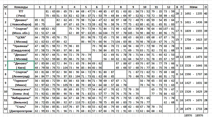 Турнирное положение после 16 матчей: 1. ТТТ — 15 побед; 2. «Динамо» (Новосибирск) — 14. 3-5. «Уралмаш», ЦСКА, «Спартак» (Московская обл.) — по 11. 6. «Динамо» (Москва) — 7. 7-8. «Горизонт» и «Динамо» (Киев) — по 6. 9-10. «Университет» и «Кибиркштис» — по 5. 11. «Спартак» (Ленинград) — 3. 12. «Сталь» — 1.