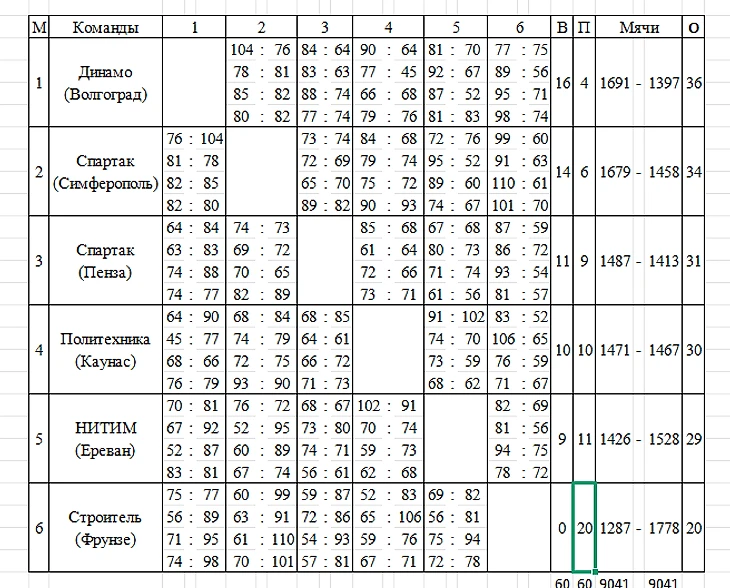 Положение команд лидирующей шестерки после 20 матчей: 1. ТТТ — 20 побед. 2–3. «Динамо» (Новосибирск) и «Спартак» (Московская обл.) — по 17. 4. ЦСКА — 15. 5. «Уралмаш» — 13. 6. «Динамо» (Москва) — 10.