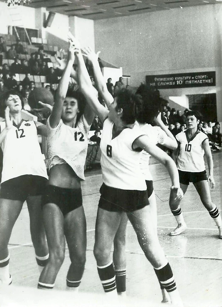 1981. Матч XLVIII чемпионата СССР «Динамо» (Новосибирск) — ЦСКА. Сибирячки (в белом, слева направо): Валентина Данилова, Елена Капутская, Любовь Антонова и Галина Палазникова против Олеси Барель (№ 6), Людмилы Рычковой (№ 13) и Валентины Котылевич (№ 11)