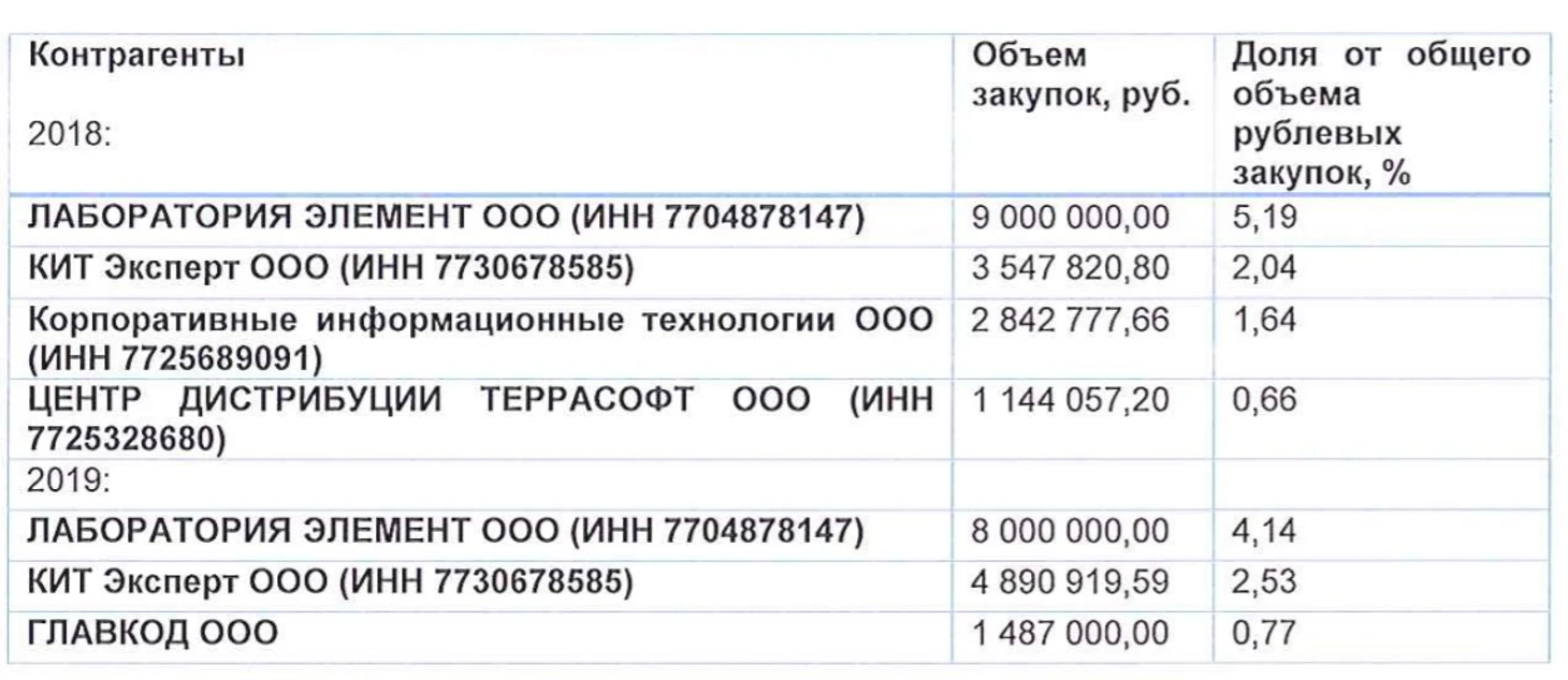 Мы отобрали компании — поставщики IТ-услуг с долей более 0,5% {более 900 000 рублей по состоянию на 2018 год} от общего объема закупок РАА РУСАДА. Данные поставщики приведены в таблице №6.