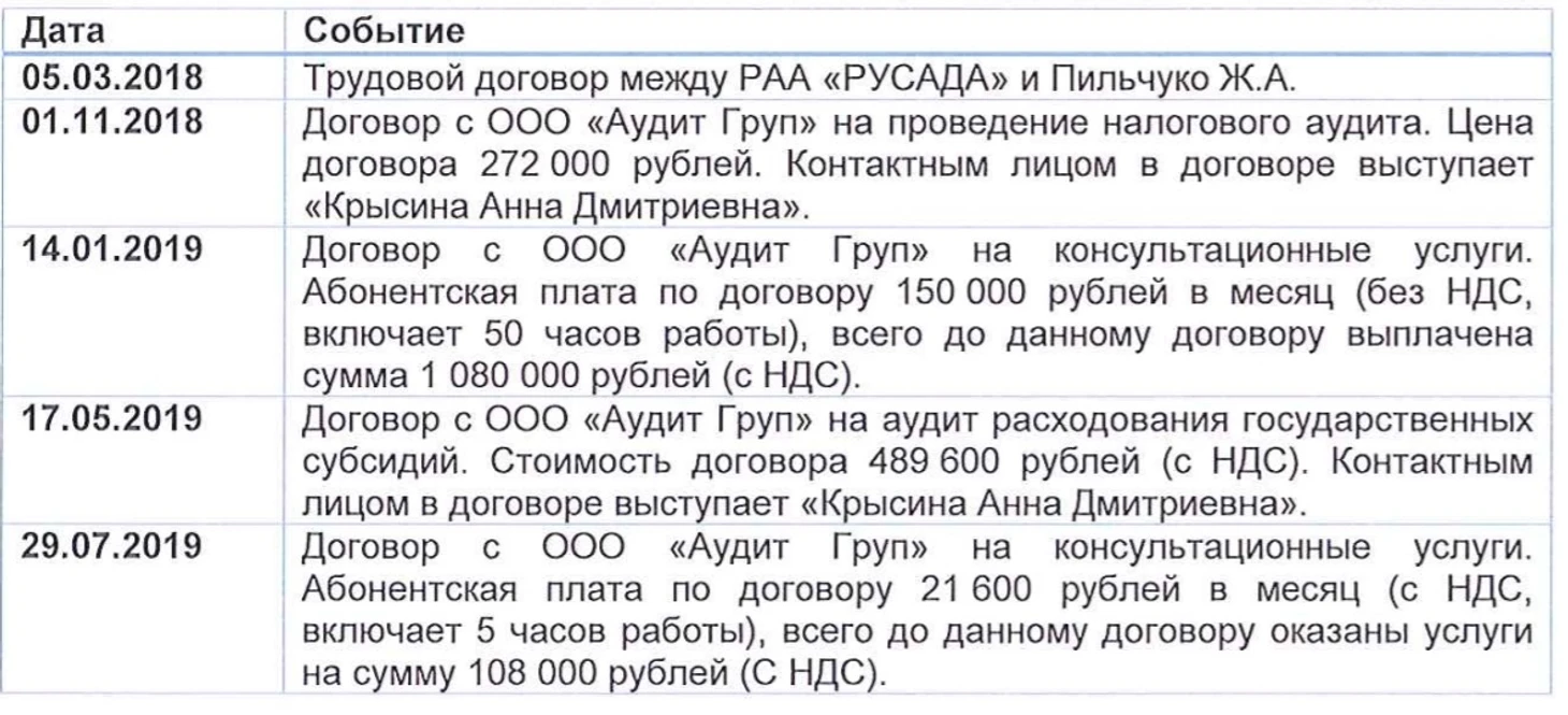 В ходе нашего исследования мы установили связь главного бухгалтера Пильчуко Ж.А. с сотрудниками 000 «Аудит Груп» в социальной сети Fасевоок, а именно лицами, указывающими о себе следующие данные: «Заместитель генерального директора в Консалтинговой компании "Аудит Груп" Анна Крысина», «Руководитель Департамента налогового консалтинга и права в Консалтинговой компании "Аудит Груп" Ольга Колозина», при этом, хронология взаимодействия РАА «РУСАДА» с 000 «Аудит труп» может указывать на факты коррупции со стороны главного бухгалтера Пильчуко Ж.А. Хронология взаимодействия РАА «РУСАДА» с 000 «Аудит Груп» приведена в таблице N 3.