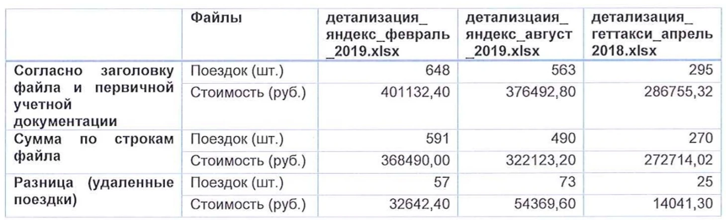 В ходе проведения исследования деятельности, нами был проведен обзор отчетов компаний — операторов такси, представленных представителем Проверяемых и первичной учетной документации к ним. При обзоре файлов и исследовании их свойств, нами установлен факт предварительной правки данных файлов перед передачей их нам, выразившийся в удалении части строк, содержащих отчеты о поездках, Разница данных по первичным учетным документам и по заголовкам в файлах с непосредственным содержанием этик файлов представлена в таблице N 5.