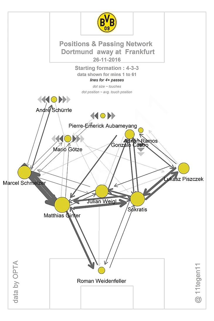 (белые линии - движение игроков "Айнтрахта", красные линии - движение мяча, жёлтые линии - движение игроков "Боруссии")