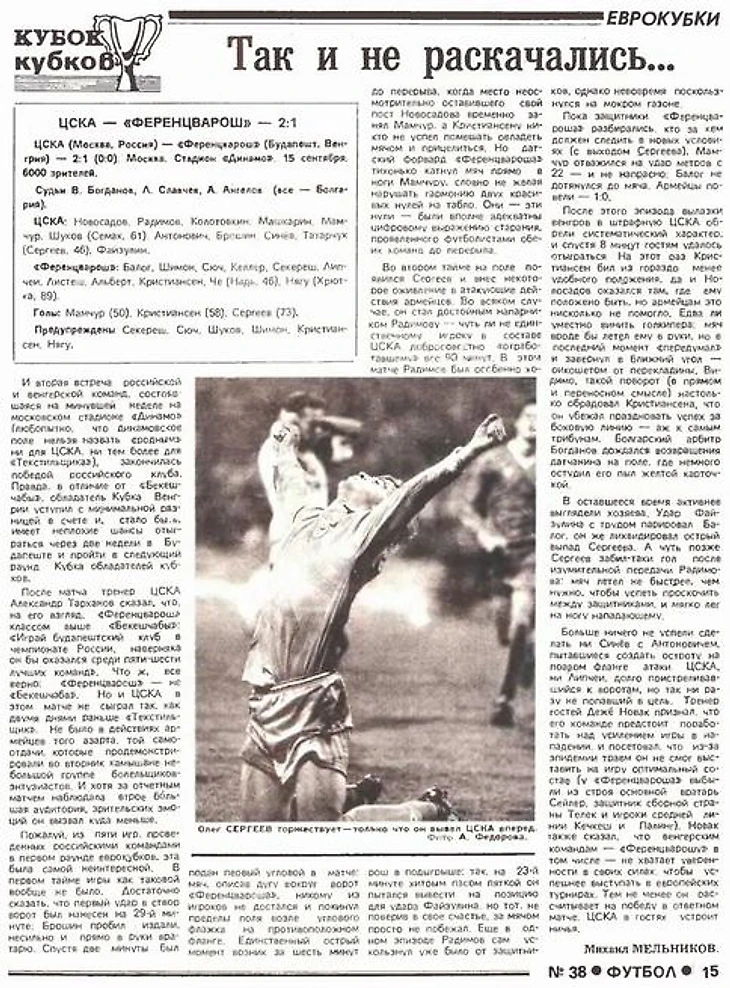 Для игроков ЦСКА были созданы немыслимые условия. Как только кто-то из них подбегал к кромке поля, в пего летели плевки и монеты. Да и игроки «Ференцвароша» вдруг оказались значительно грубее, чем в Москве. Это был очень тяжелый в психологическом плане матч - лишь только наш вратарь Новосадов не растерялся и по случаю наезжал на оборзевших «Фради», отвесив один раз игроку Листьешу неслабый пинок.