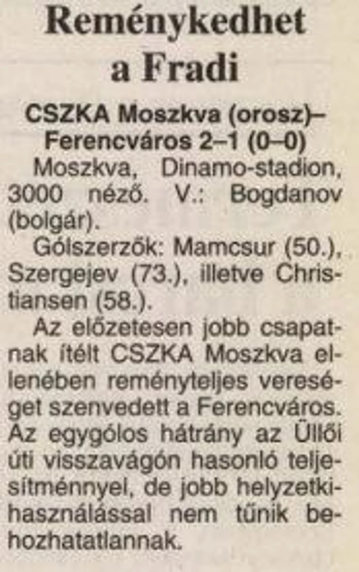 раньше, и лишь только Бандит, Жарик и Таракан, устроившие дебош в поезде и чуть не попавшие в Киеве в милицию, все никак не могли пробиться через таможню), и устав от экскурсий по городу, братва решила заняться делом, а именно, показать, кто, собственно, приехал в Будапешт. (Подбодрило сообщение от трех наших программистов (программистами в 80-90-е годы называли тех болел, кто хоть и выезжал в другие города, но делал это отдельно от фанов. К тому же, данный контингент коллекционировал футбольные программки, что являлось распространенным хобби - прим. РФВ), бывших на матче ЕК «Гонвед» - «Твенте», и принесших печальные вести - местные «фэны», узнав, что они из ЦСКА, чуть не дали им в морду и сказали, что «Фради» их убьют точно).