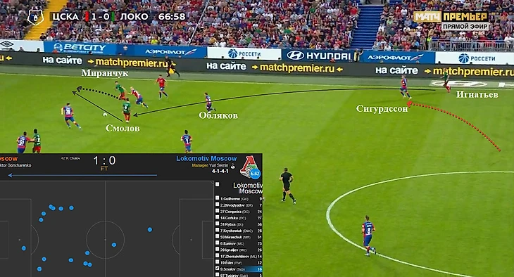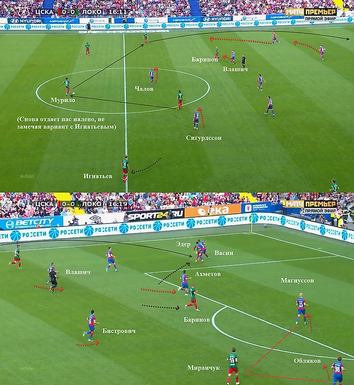 «Локомотив» в первом тайме всё-таки несколько раз доводил мяч до своего правого фланга. В таких ситуациях ЦСКА либо включался в очень агрессивный прессинг и старался атаковать соперников до приёма (Обляков вылетал на Живоглядова только в подобных случаях), либо пытался создавать 2 vs 1 против Миранчука за счёт контроля Алексея Бистровичем и наличия подстраховки. Магнуссон в таких случаях опускался глубже и контролировал Игнатьева, который также сделал несколько рывков к штрафной хозяев.