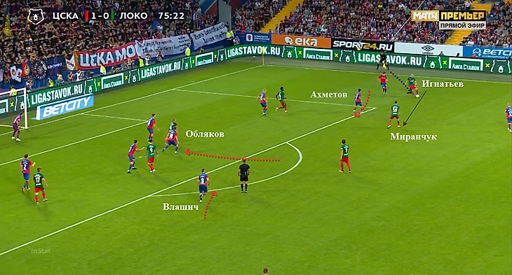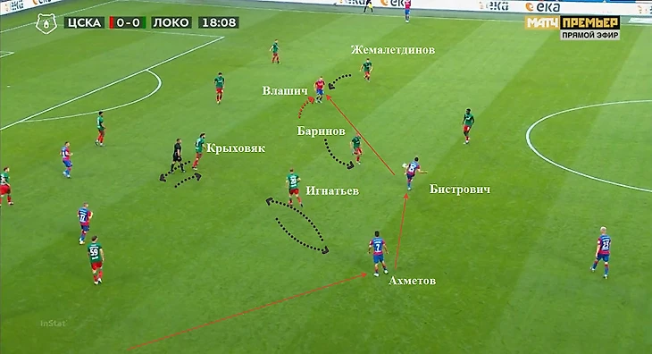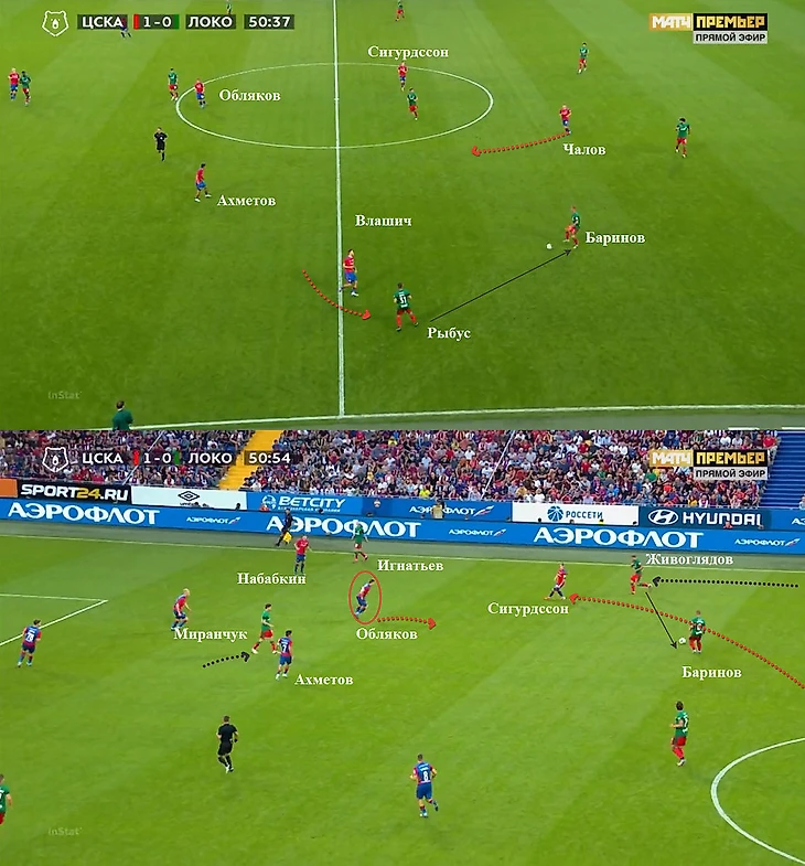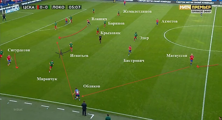 Когда ЦСКА загонял «Локо» направо, у гостей оставалось два варианта: заброс вперёд или пас назад. Тройка полузащитников армейцев не обязательно формировала чёткий треугольник: Влашич обычно располагался повыше, Бистрович варьировал свою позицию в зависимости от положения Миранчука, а Ахметов – в зависимости от расположения ближайшего полузащитника «Локомотива» между линиями. При этом Сигурдссон опускался чуть глубже и закрывал прямой перевод на Игнатьева.