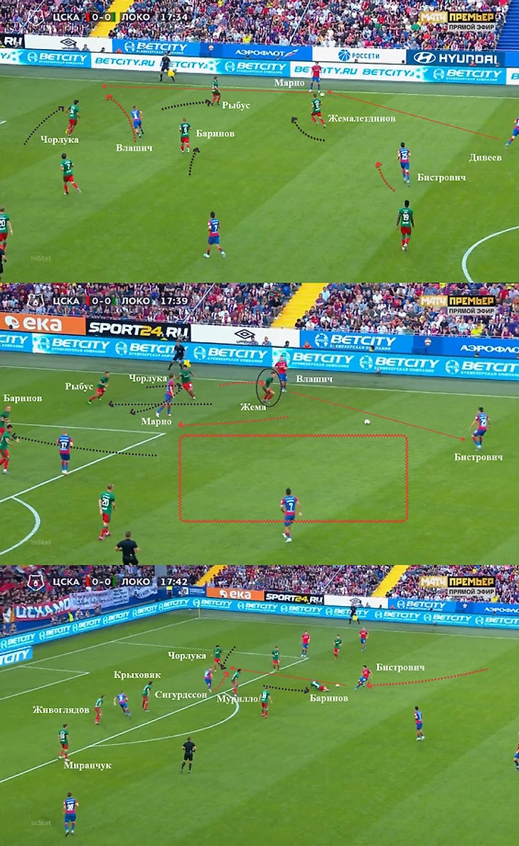 В первую очередь ЦСКА должен был заставить «Локомотив» больше использовать левый фланг, на котором находился не Алексей Миранчук, а Жемалетдинов. В высоком прессинге Чалов и Сигурдссон старались оказывать давление на Мурило и Чорлуку, одновременно перекрывая линию передач на Игнатьева и Крыховяка (если те не отходили глубже и шире); Влашич и Бистрович контролировали одновременно Игнатьева и Крыховяка и передачи в свой полуфланг; Ахметов контролировал пространство между линиями и следил за полузащитником «Локомотива» (как правило – Бариновым), если он там оказывался. Армейцам помогла правоногость Чорлуки, который в паре с Мурило играл левее – Чалову гораздо проще было закрывать ему возможность отдать передачу на того же Мурило или в центр.